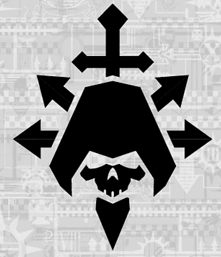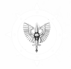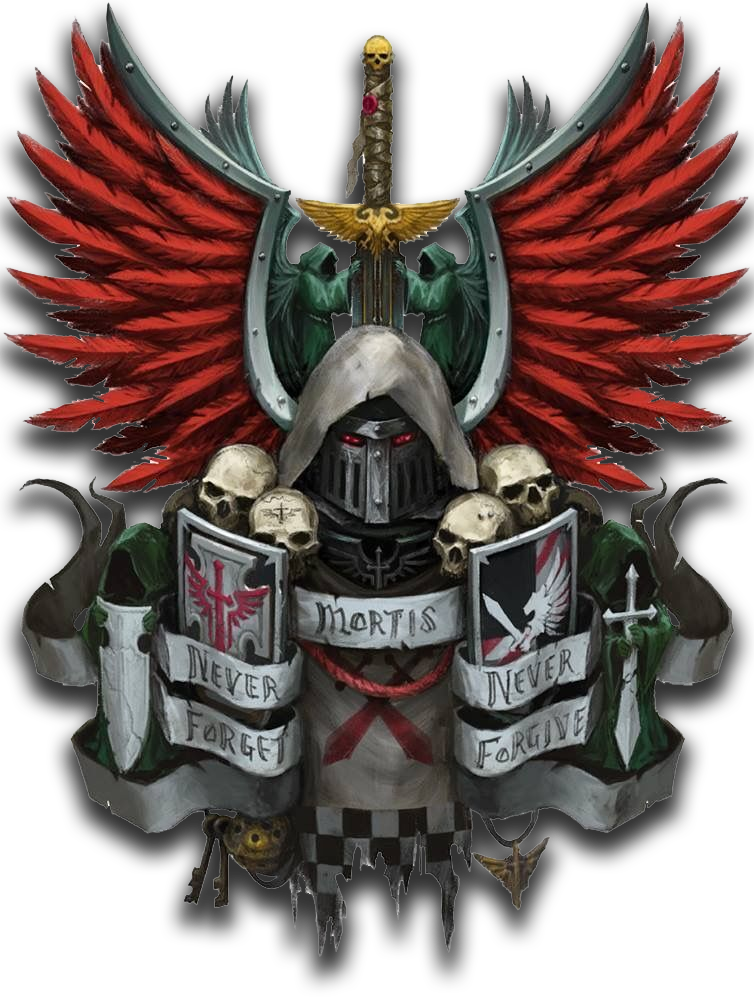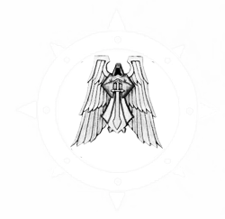 The Dark Angels Legion badge is a white winged sword with furled wings, which was the ancient icon of the Calibanite knightly order known simply as The Order that preceded and was integrated into the main legion, on a checkered field of black and red. Variants of this symbol exist for the six wings of the Hexagrammaton: the Deathwing, the Ravenwing, the Dreadwing, the Ironwing, the Firewing, and the Stormwing, as well as the specialist ranks of the legion.